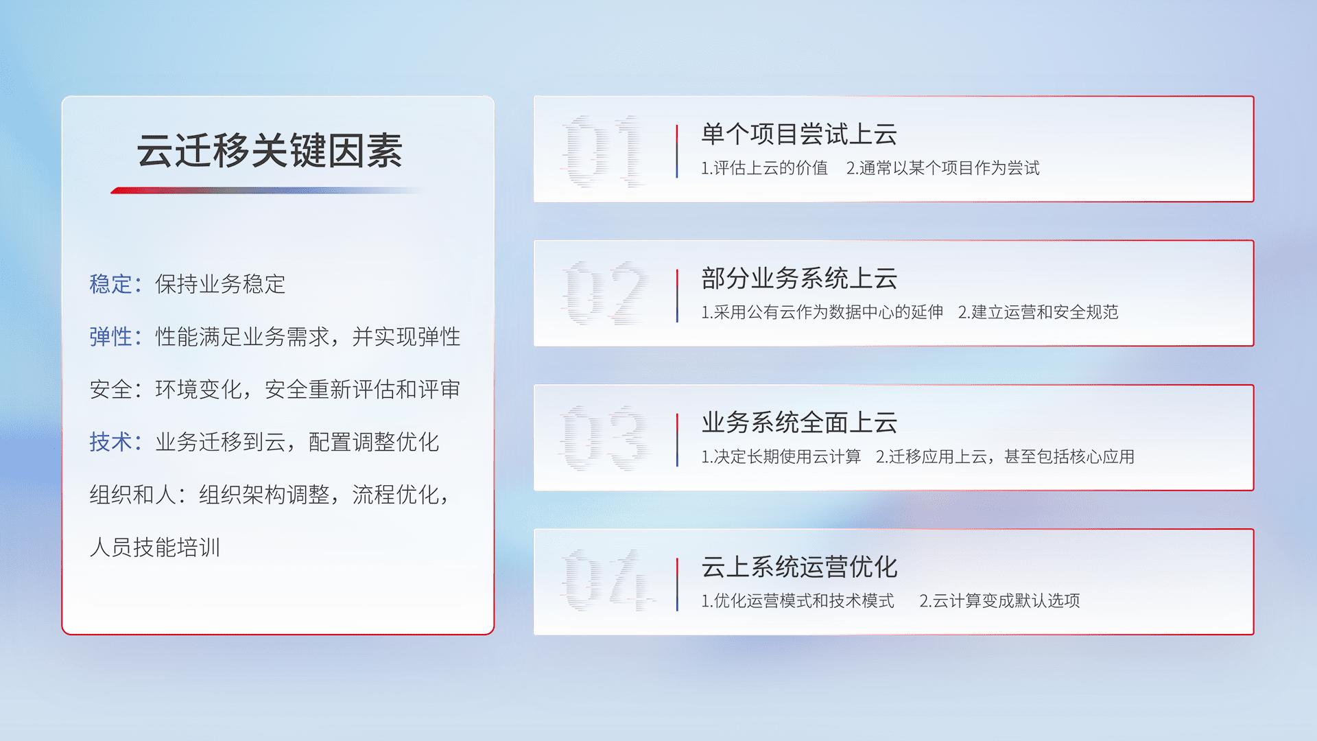 结合实际业务,,从规划设计、、云平台选型、、、、云原生改造、、数据迁移、、、、集成交付,,迁移全过程为客户识别最佳上云路径,,,,做好风险识别管理,,,设计网络架构、、身份权限、、、安全审计合规、、、、操作审计、、、日志审计、、监控告警策略、、、多站点容灾设计等,,对云上基础设施进行整体规划,,提升IT治理水平,,,以满足弹性、、、、高可用、、高性能的需求。。。。
