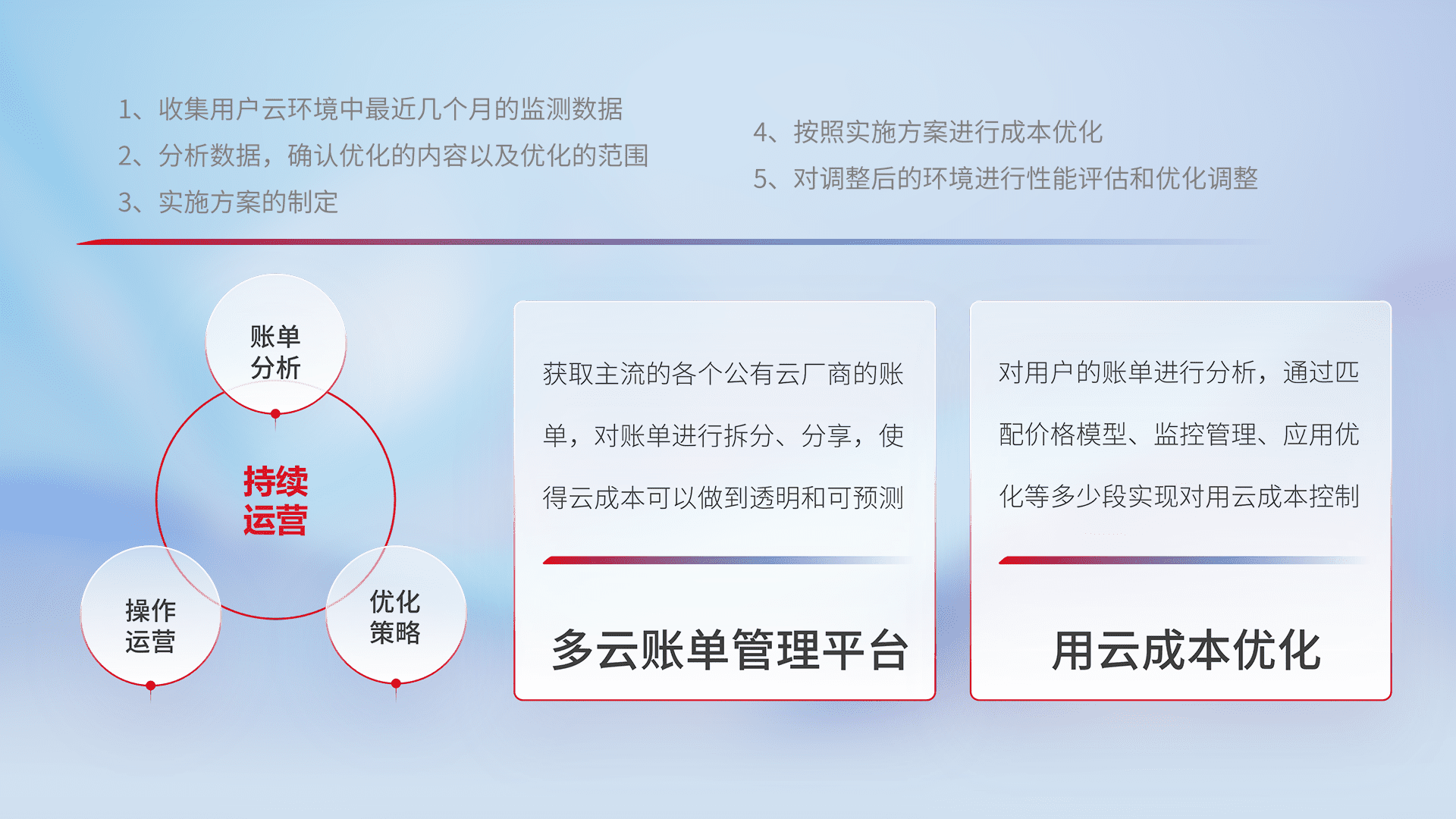 通过多云纳管,,以统一的资源数据模型把客户的云资源进行抽象和封装,,进而实现对多云资源的统一操作,,保障云资源管理的可靠性、、、稳定性与可用性。。量身定制化运维内容,,,,配置、、、、开发运维、、补丁管理、、、备份、、、监控、、认证和访问管理、、、审计和日常巡检等,,,,保障在用云过程中的可靠度,,,稳定度以及高可用率。。。